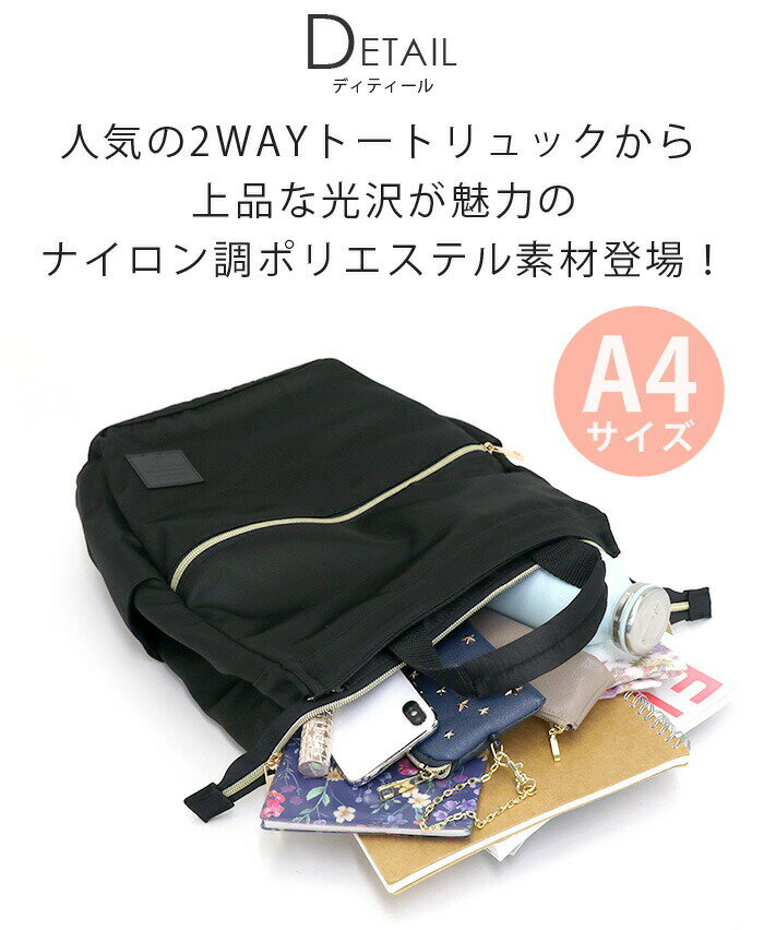 メーカー希望小売価格はメーカーサイトに基づいて掲載しています使用スタイル例≪通学≫≪通勤≫≪ママバッグ≫≪ファッション≫こんな方へ≪女性≫≪大学生〜≫≪かわいい≫≪シンプル≫商品の特徴≪リュックサック≫≪トートバッグ≫≪A4サイズ≫カラー・柄区分≪ブラック≫≪グレー≫≪ベージュ≫≪レッド≫≪ピンク≫話題のブランド【DELDE】から一瞬でトートからリュックにチェンジできるトートリュックから、上品な光沢感がきれいめな印象のナイロン調ポリエステル素材、登場!人混みの中でトートにしたいとき。